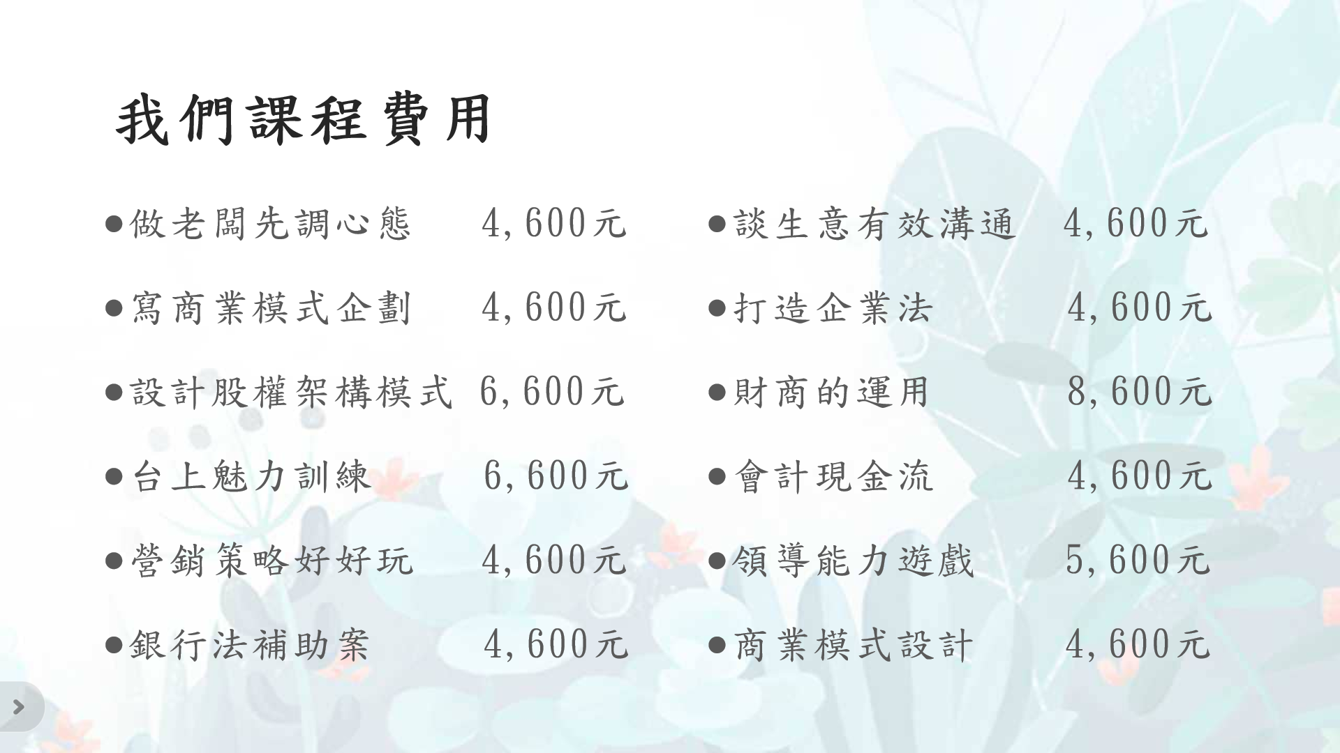 許多人都希望能寫出一份出色的企劃案,向銀行或政府申請貸款或補助,然而,大部分人往往只覺得自己的企劃案很好,卻忽略了從第三方的角度去思考。現在,我們將嘗試站在銀行和政府的立場來看問題,學習如何有效地向他們展示你的投資與效應。首先,每個人將寫下自己的優勢,並由專業老師進行指導,這是一種網路上學不到的實戰模式。最後,你將上台展示,並由其他學員扮演銀行和政府機構,聽聽他們的反應:如果是他們,會不會願意投資你?